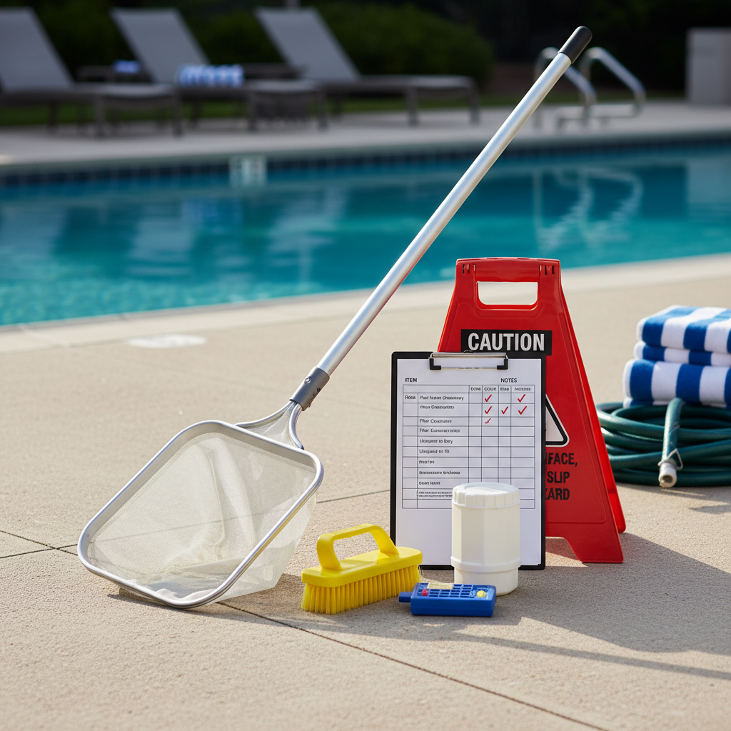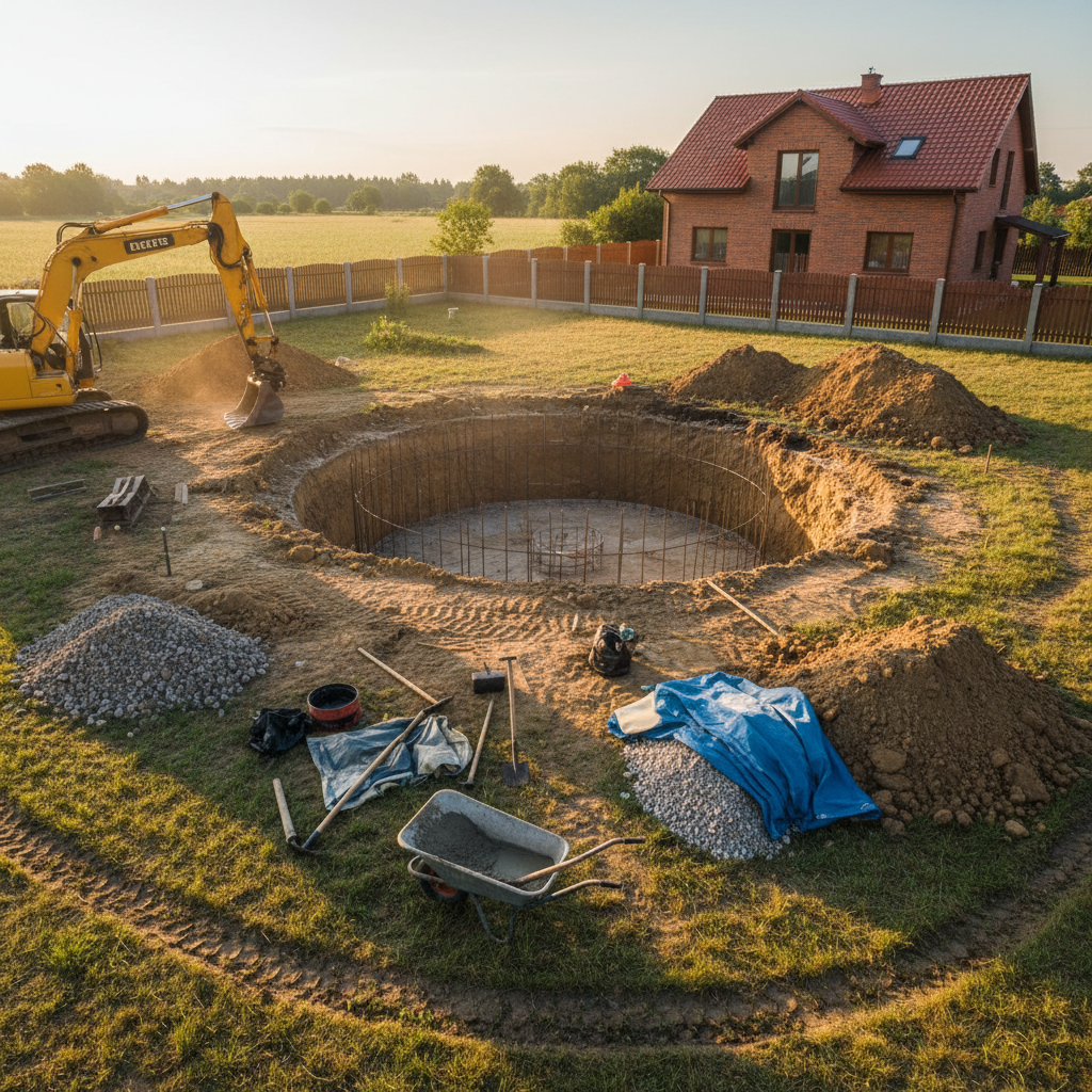 - Przygotuj miejsce na akcesoria – Dostęp do prądu (pompa), schowek na chemię i narzędzia.