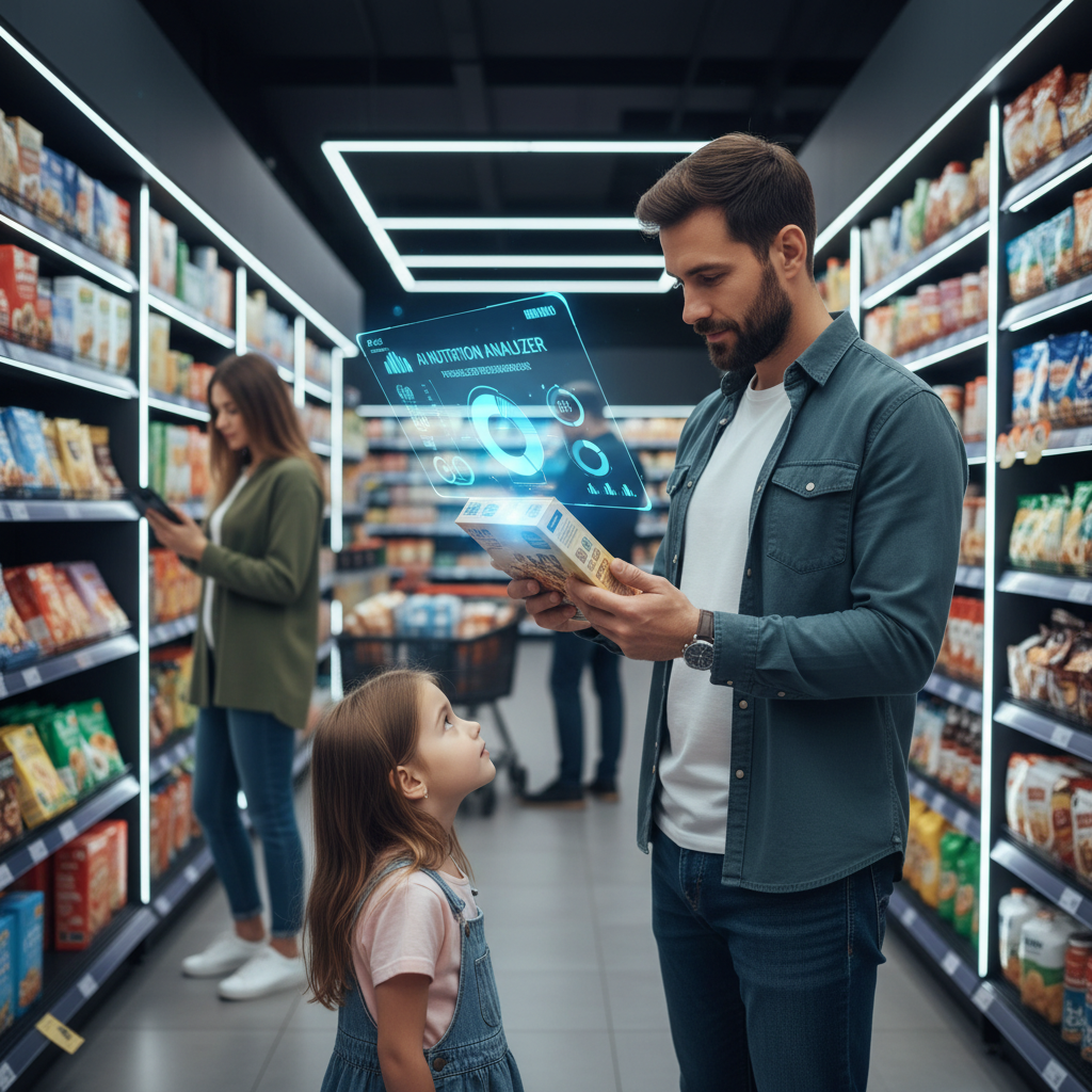Zdjęcie: nowatorskie wykorzystanie AI podczas rodzinnych zakupów w sklepie.